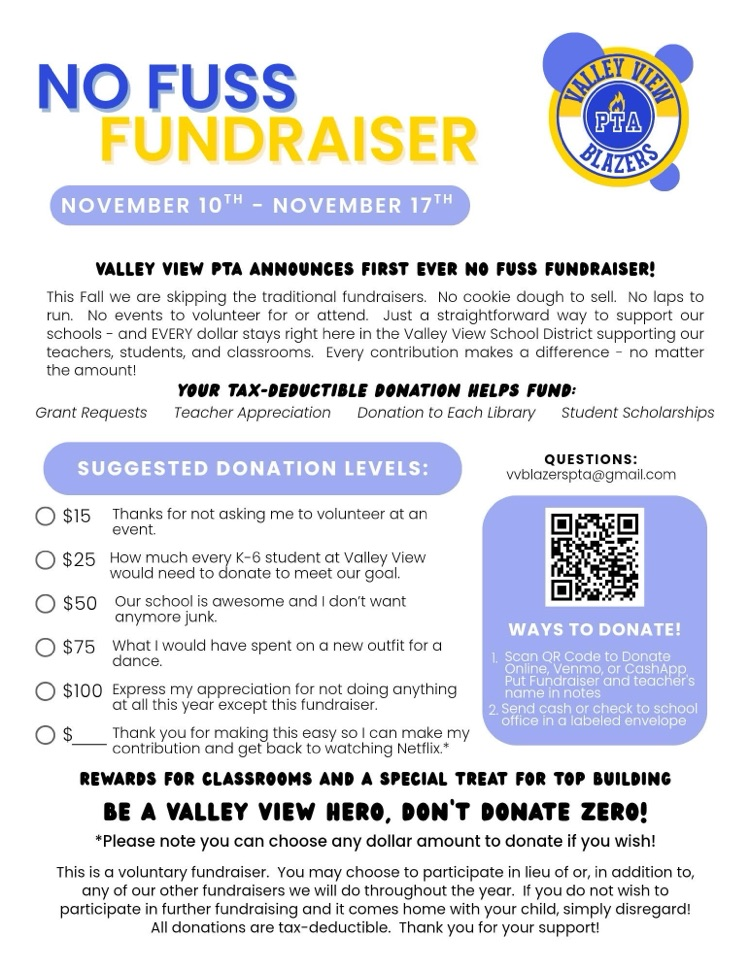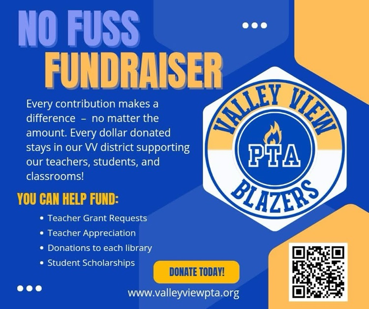 Don’t miss Valley View PTA’s No Fuss Fundraiser! 💙 ✅ No selling. No collecting. NO FUSS. Just a direct donation that goes STRAIGHT to programs, supplies, and activities that benefit our students and teachers at Valley View School District! 💲 Every dollar makes a difference — whether it’s $5, $25, or $100, your contribution helps us fund classroom resources, teacher appreciation events, student scholarships, and so much more! 💻 Donate today: https://linktr.ee/vvblazerspta 📅 Fundraiser runs from November 10th to November 17th. 🚨 Please add Fundraiser along with your student's homeroom teacher's name. 🎉 Let’s show our school spirit and make this our easiest (and most successful!) fundraiser yet! 💙💛🔥