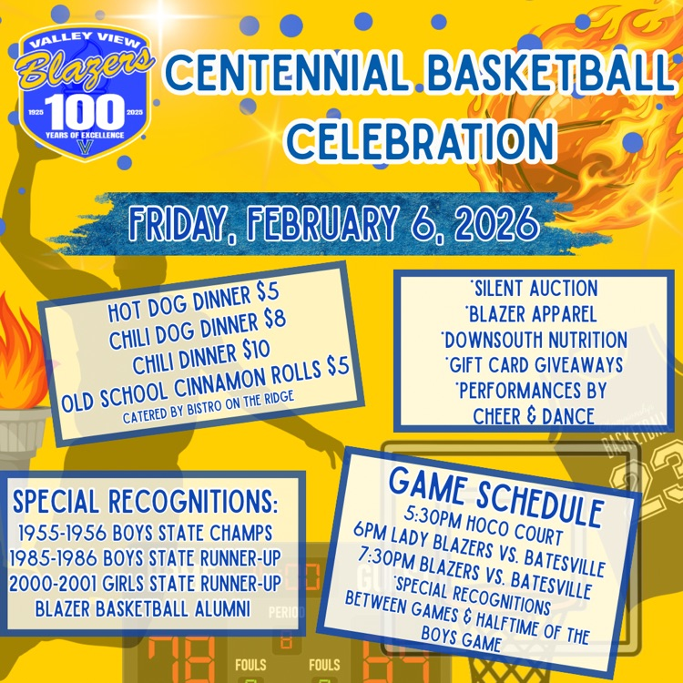 Calling all former Blazer basketball players — this night is for YOU! Come reconnect, reminisce, and show your #BlazerPride as we celebrate 100 years of tradition and excellence at Valley View. 💙💛