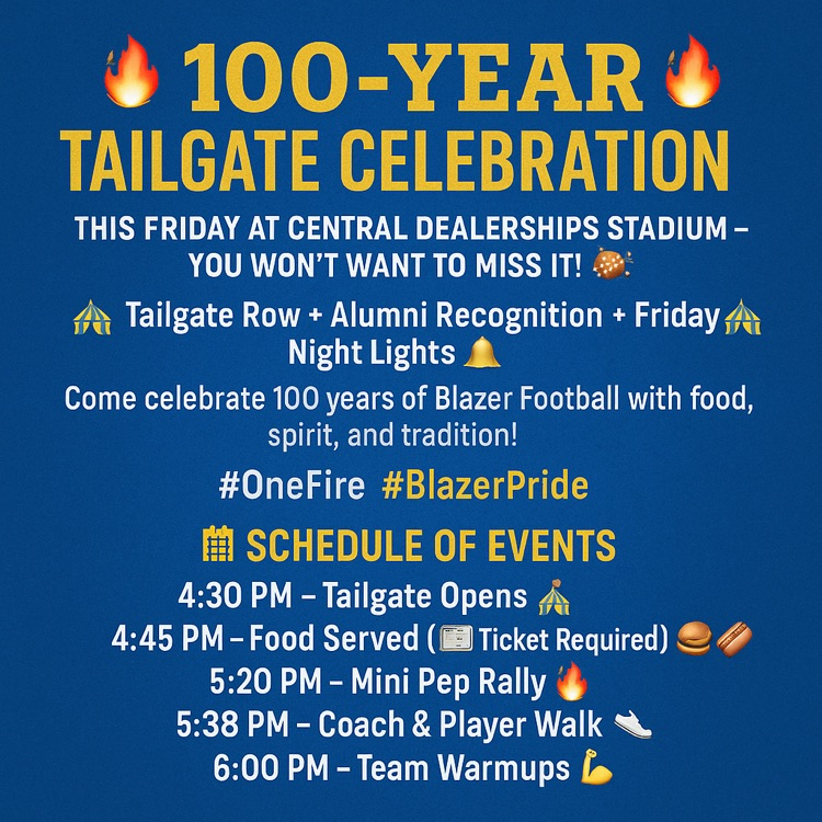 Join us for the Centennial Celebration Tailgate as we honor 🔥100 Years of Lighting the Flame🔥 on Friday, September 12 • 4–7 PM, before the Blazers take on West Memphis! 💪