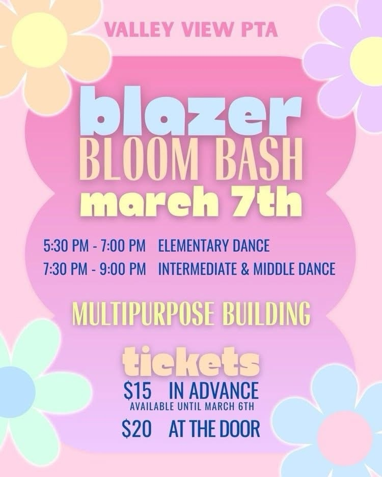 🌸The Valley View PTA Blazer Bloom Bash is Saturday! Join us for a fun night of music, dancing, and school spirit!