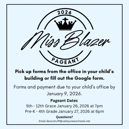 Pay Online: https://2026-miss-valley-view-blazer-pageant.cheddarup.com (https://2026-miss-valley-view-blazer-pageant.cheddarup.com/)