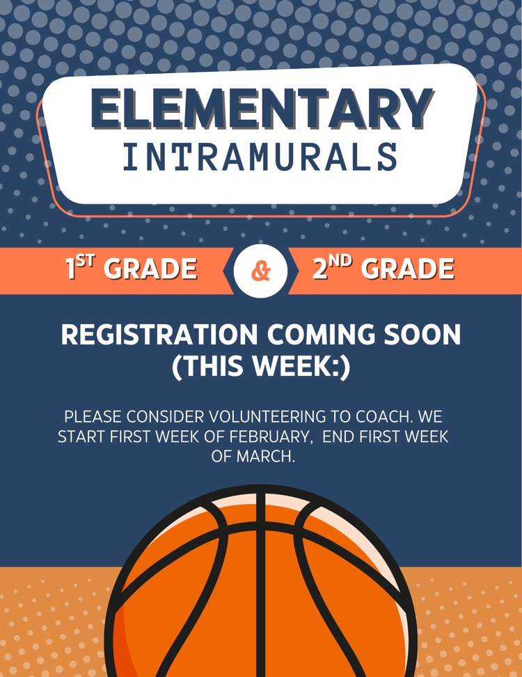 1st & 2nd grade students will have the chance to sign up this week! Intramurals will run from the first week of February through the first week of March.